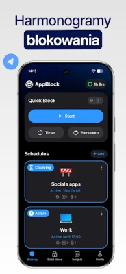 AppBlock -Blokuj Appki, Strony to narzędzie, które pomoże Ci skupić się na najważniejszych zadaniach. Blokuj rozpraszające aplikacje, strony internetowe i media społecznościowe, przejmij kontrolę nad czasem ekranowym i osiągnij cyfrowe samopoczucie.