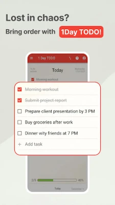Czy codzienny natłok zadań sprawia, że czujesz się przytłoczony? Odkryj **1 Day TODO: Daily Task Manager** – Twojego niezawodnego asystenta w zarządzaniu codziennym harmonogramem. Ta innowacyjna aplikacja została zaprojektowana, abyś mógł skupić się na tym, co najważniejsze, oferując przy tym pełen zestaw funkcji bez żadnych ukrytych kosztów czy subskrypcji. Pozwala na tworzenie intuicyjnych list zadań, które wspierają Cię w realizacji celów, automatycznie przenosząc niewykonane zadania na kolejny dzień, byś zawsze zaczynał z czystą kartą, nie tracąc przy tym nic z widoku.