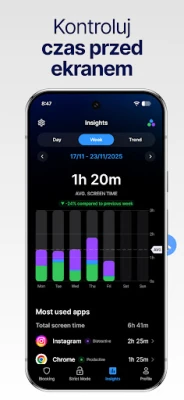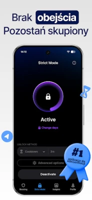 AppBlock to kompleksowy zestaw narzędzi umożliwiających personalizację Twojego cyfrowego środowiska. Z łatwością zablokuj nieproduktywne aplikacje, gry oraz strony internetowe, które marnują Twój cenny czas. Twórz elastyczne harmonogramy blokowania, które automatycznie aktywują się w określonych porach, lokalizacjach lub w zależności od połączenia Wi-Fi, wymuszając koncentrację podczas pracy czy nauki. Dla tych, którzy potrzebują wzmocnienia swojej determinacji, Tryb Restrykcyjny uniemożliwia obejście ustawionych ograniczeń, pomagając w budowaniu trwałych nawyków. Użytkownicy AppBlock często notują znaczące skrócenie czasu spędzanego przed ekranem – niektórzy nawet o ponad 30% już w pierwszym tygodniu, odzyskując cenne godziny każdego dnia.
