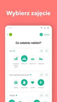 Sercem działania Daylio jest intuicyjny system, który pozwala na ekspresowe rejestrowanie Twojego samopoczucia i wykonanych czynności. Codziennie po prostu wybierasz odzwierciedlający Twój nastrój symbol i zaznaczasz aktywności, w których brałeś udział. Możesz wzbogacić każdy wpis o krótkie notatki lub zdjęcia, tworząc żywy, wizualny pamiętnik wspomnień. Co więcej, aplikacja to potężne centrum do kreowania zdrowych nawyków i precyzowania celów, które naprawdę odmienią Twoją codzienność. Niezależnie czy chcesz regularnie nawadniać organizm, zwiększyć aktywność fizyczną, wcześniej kłaść się spać, czy wprowadzić medytację – Daylio będzie Twoim cichym motywatorem, monitorującym postępy i przypominającym o ważnych zadaniach.