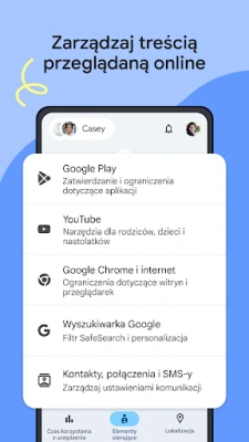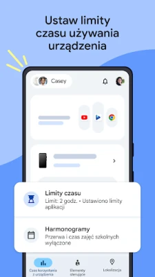 Family Link to Twoje centrum zarządzania cyfrowym światem dzieci. Pozwól swoim pociechom czerpać radość z technologii, jednocześnie ucząc je zdrowych nawyków. Z łatwością ustalaj ramy czasowe na korzystanie z urządzeń, tworząc harmonogramy, które wspierają naukę, zabawę i odpoczynek. Family Link daje Ci swobodę dostosowania limitów dla poszczególnych aplikacji, umożliwiając nieograniczony dostęp do tych edukacyjnych, a także możliwość zablokowania dostępu do innych, gdy zajdzie taka potrzeba. To elastyczne narzędzie, które pomaga budować świadomą i zrównoważoną relację z technologią.
